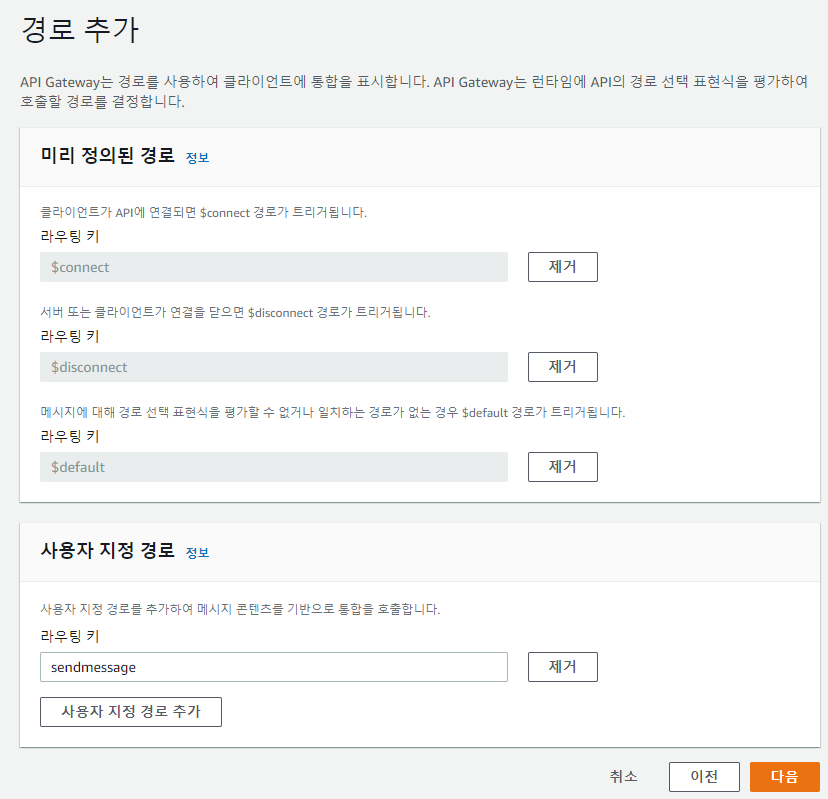 다음으로 넘어가 $connect / $disconnect / $default 다 추가하기.